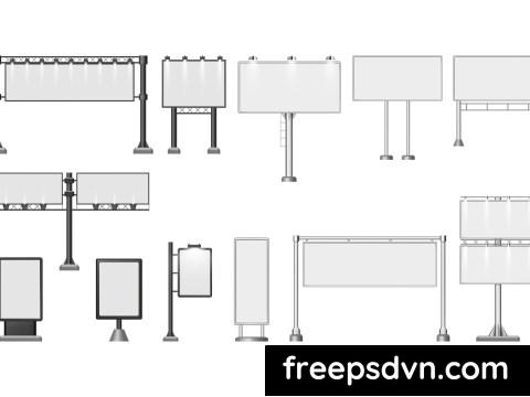 Signboard with lights for advertising and promotion. Vector isolated set of billboards on poles, stand for commercial or announcement display, screen with illumination for city, exhibition placard